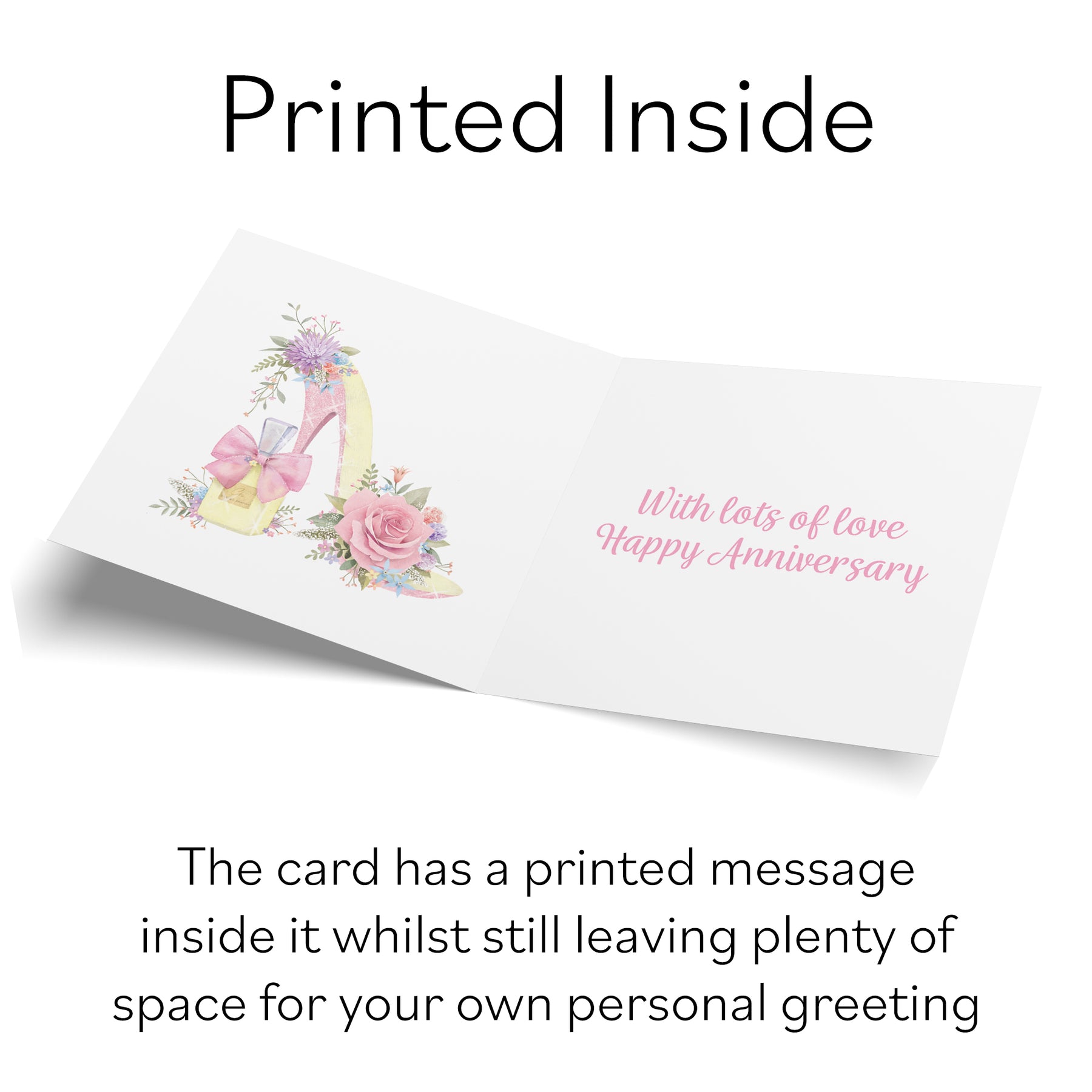This beautiful card features an elegant high heel and classic perfume bottle surrounded by butterflies, hearts, stars, and delicate floral details.