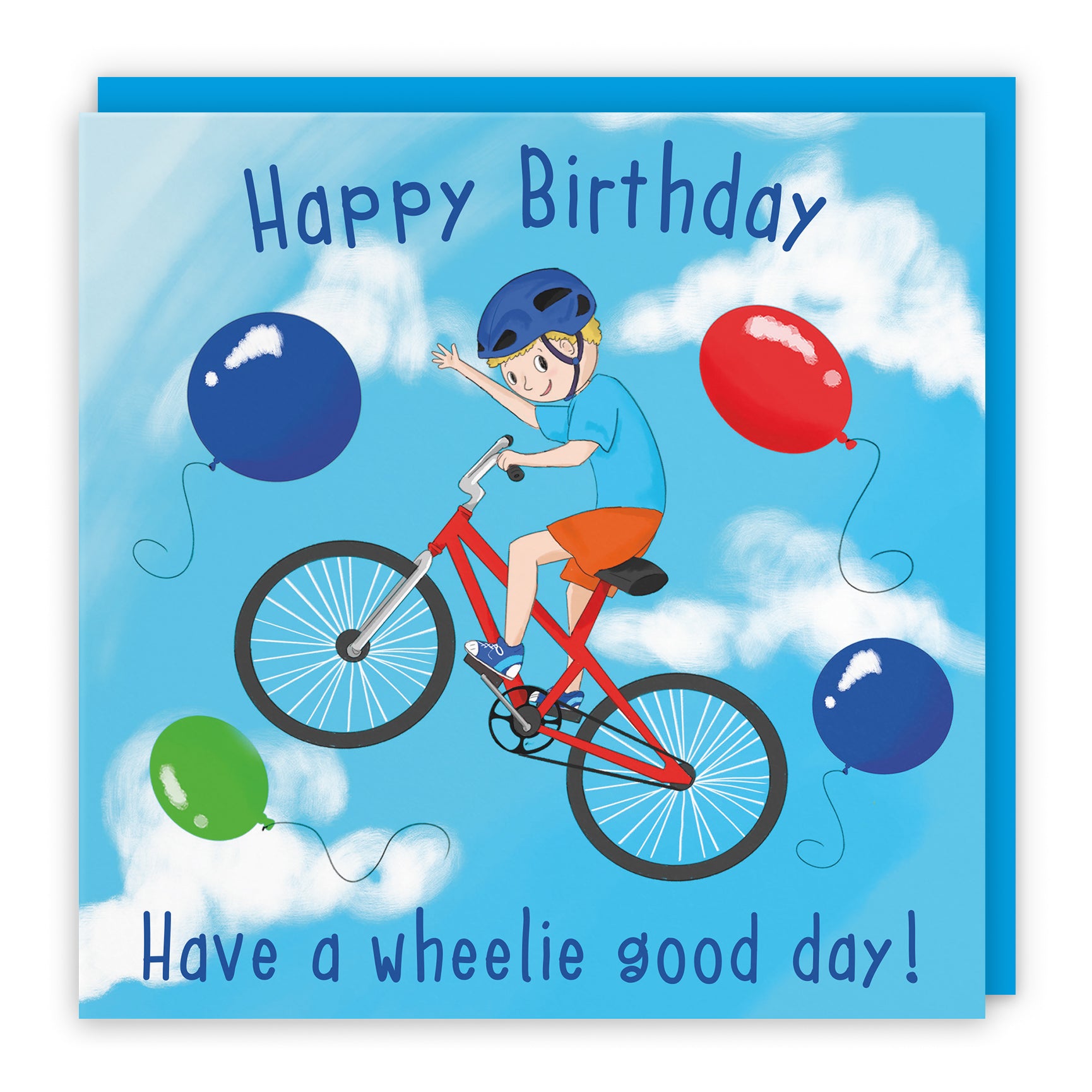 A bright and cheerful illustration featuring a young cyclist popping a playful wheelie as colourful balloons float through a sky of soft, fluffy clouds. Full of movement, joy, and birthday fun, it’s a vibrant design perfect for any bike-loving child.