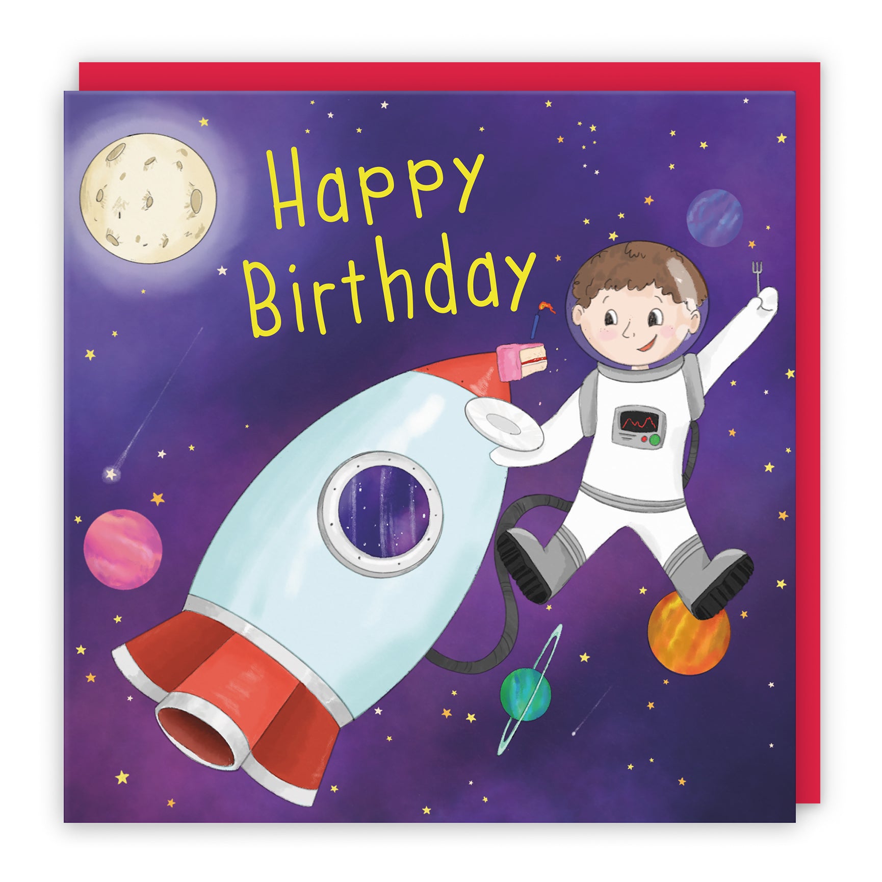 A fun space-themed scene featuring a young astronaut floating among colourful planets, stars, and a rocket ship - perfect for any child who dreams of exploring the galaxy on their birthday.