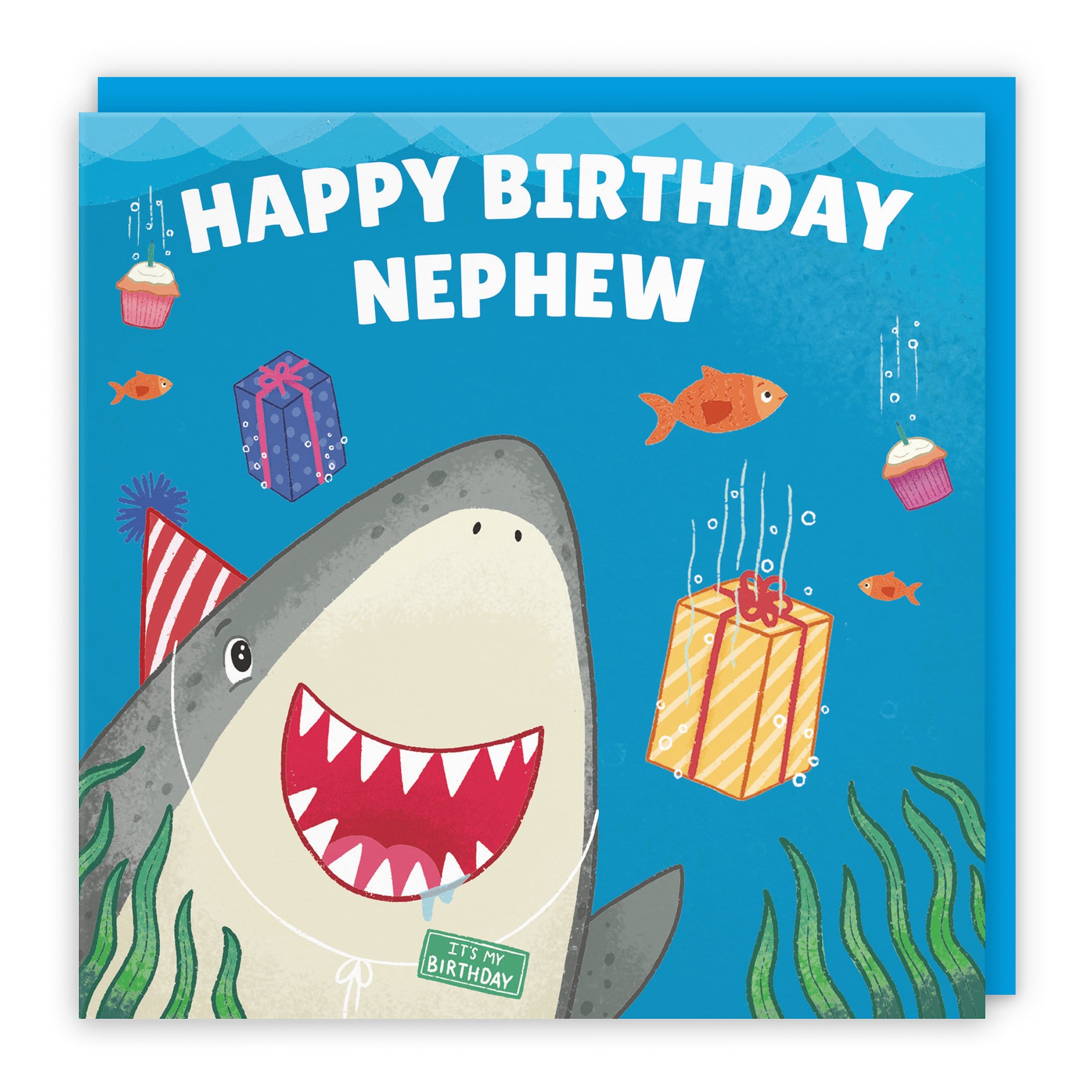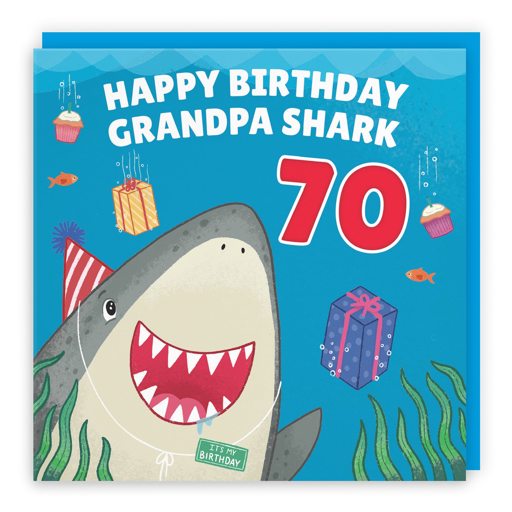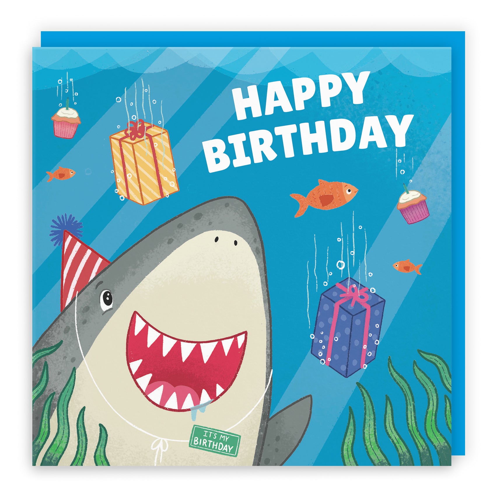 A fun underwater birthday scene with a cheerful shark, perfect for celebrating in style.