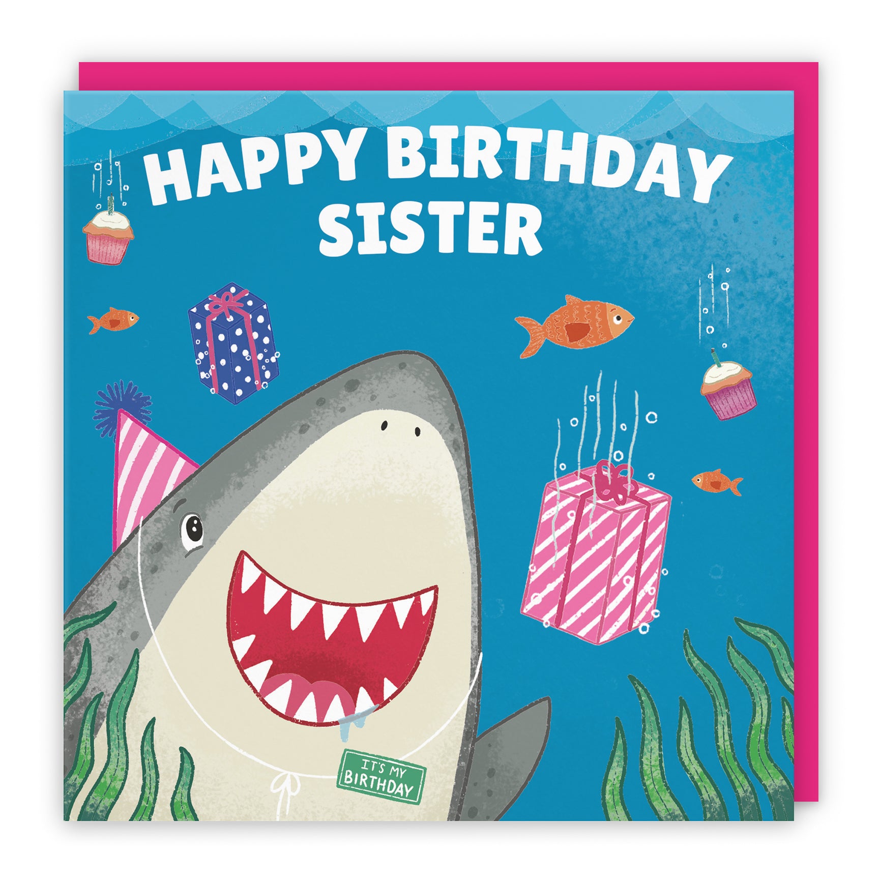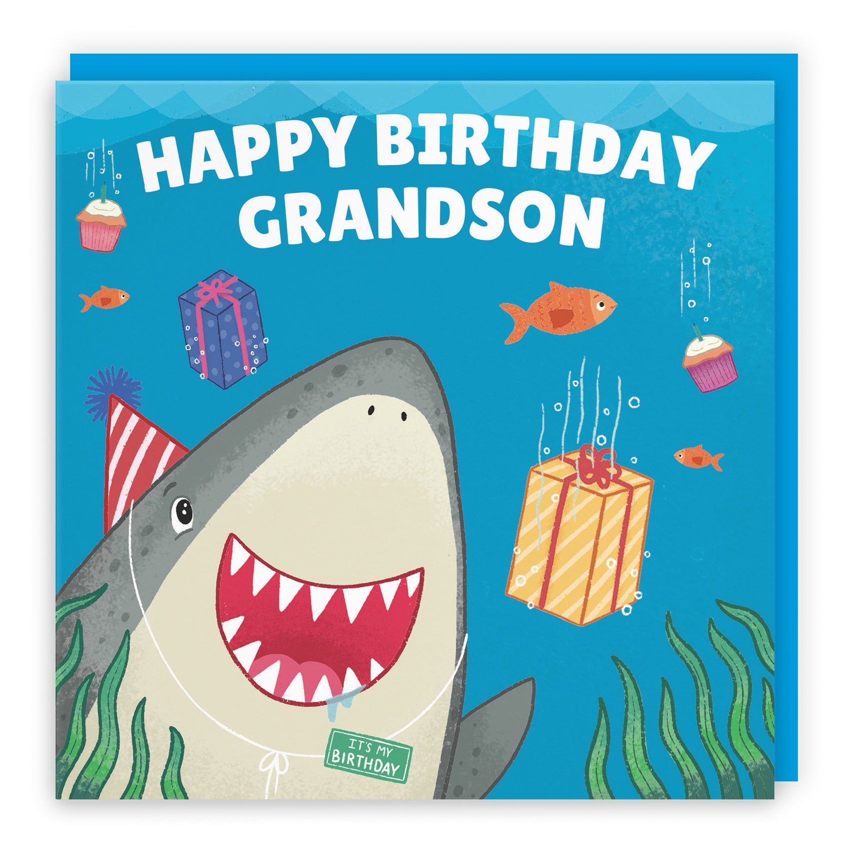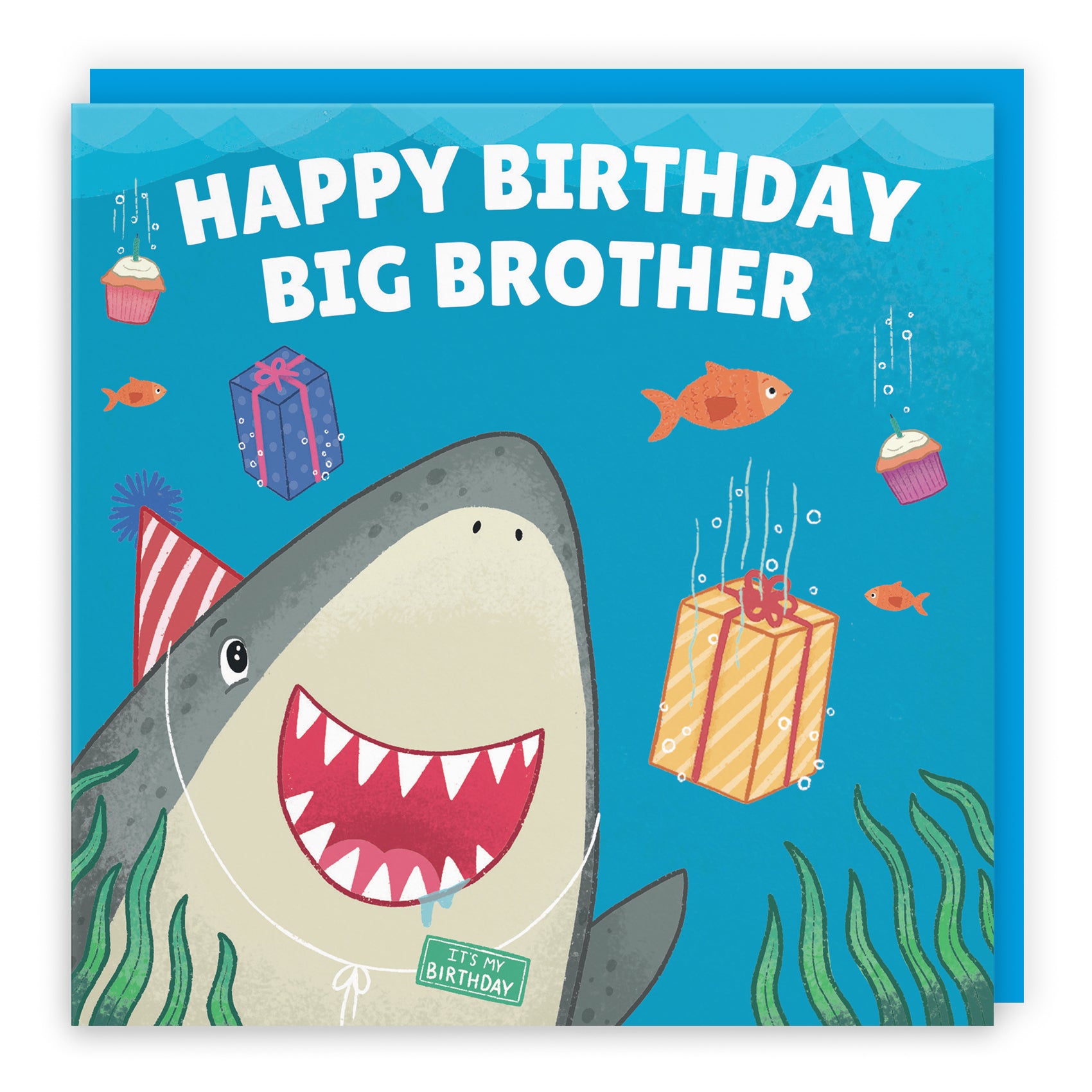 A fun underwater birthday scene with a cheerful shark, perfect for celebrating in style.