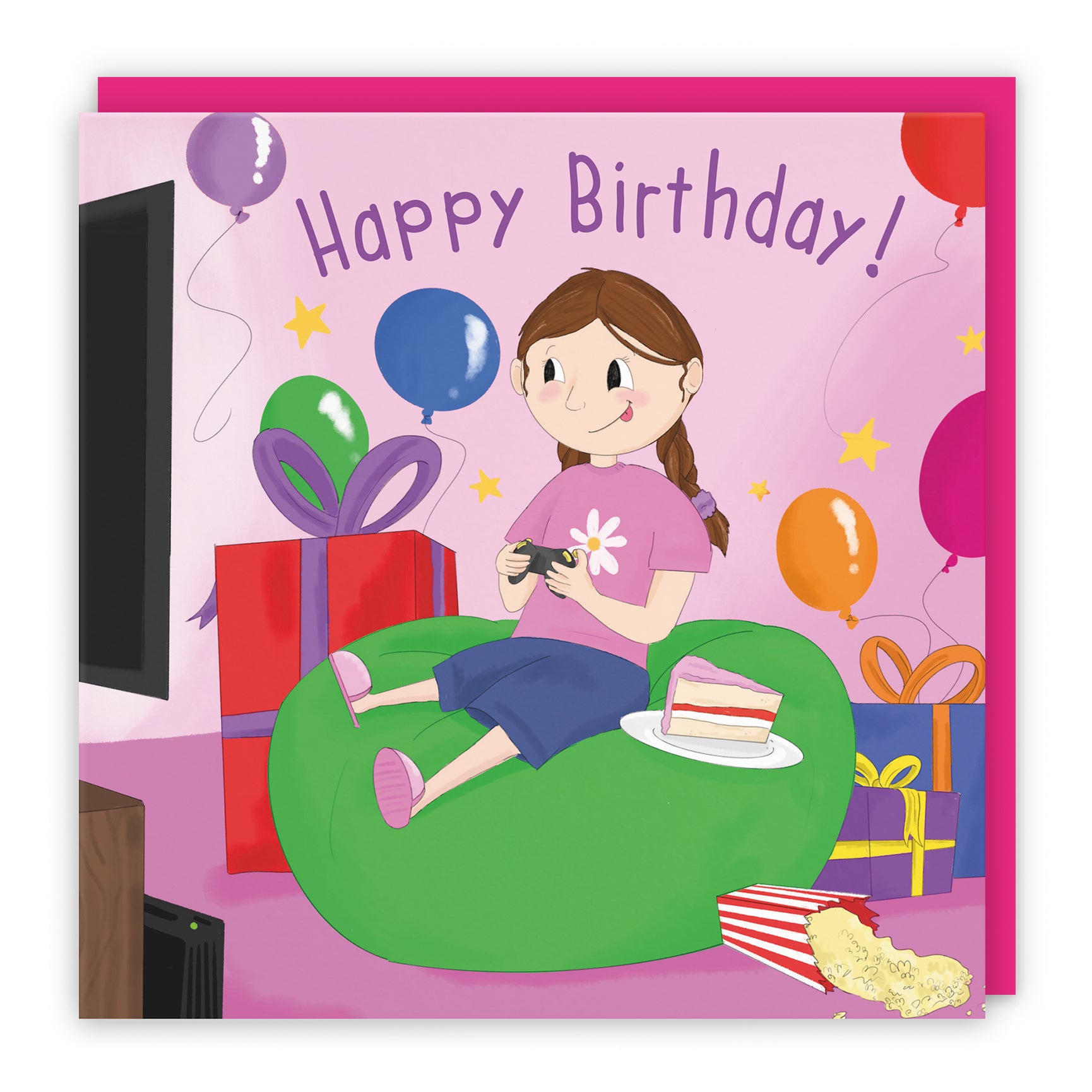 A fun and colourful gaming-themed scene featuring a girl relaxing on a beanbag, controller in hand, surrounded by birthday balloons, presents, popcorn and cake. A playful design perfect for any young gamer celebrating their special day.