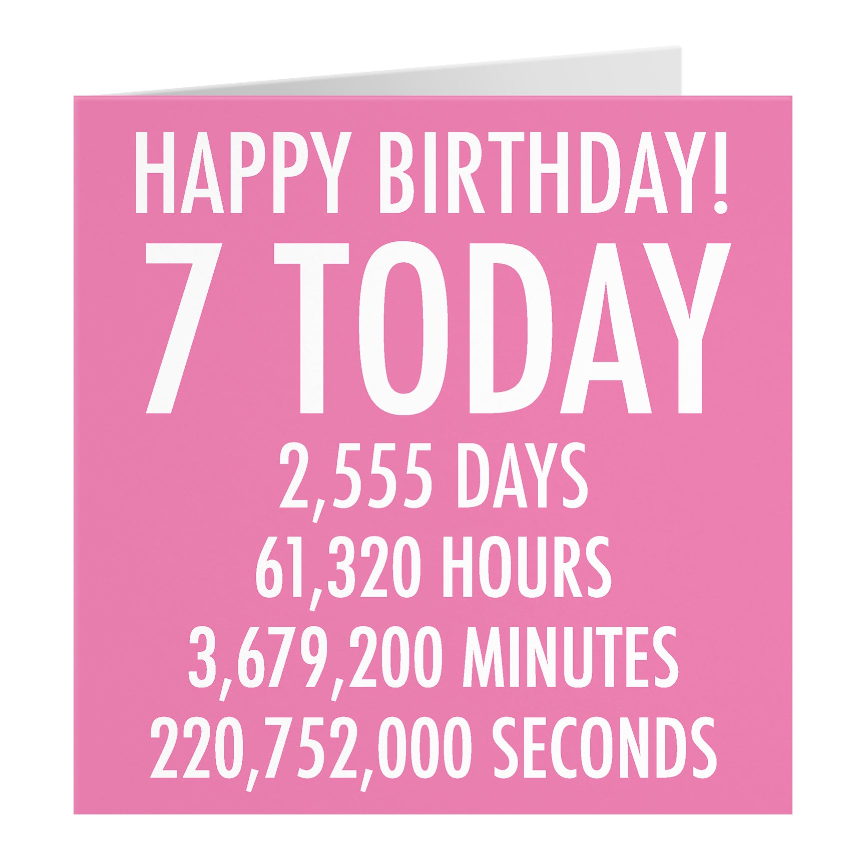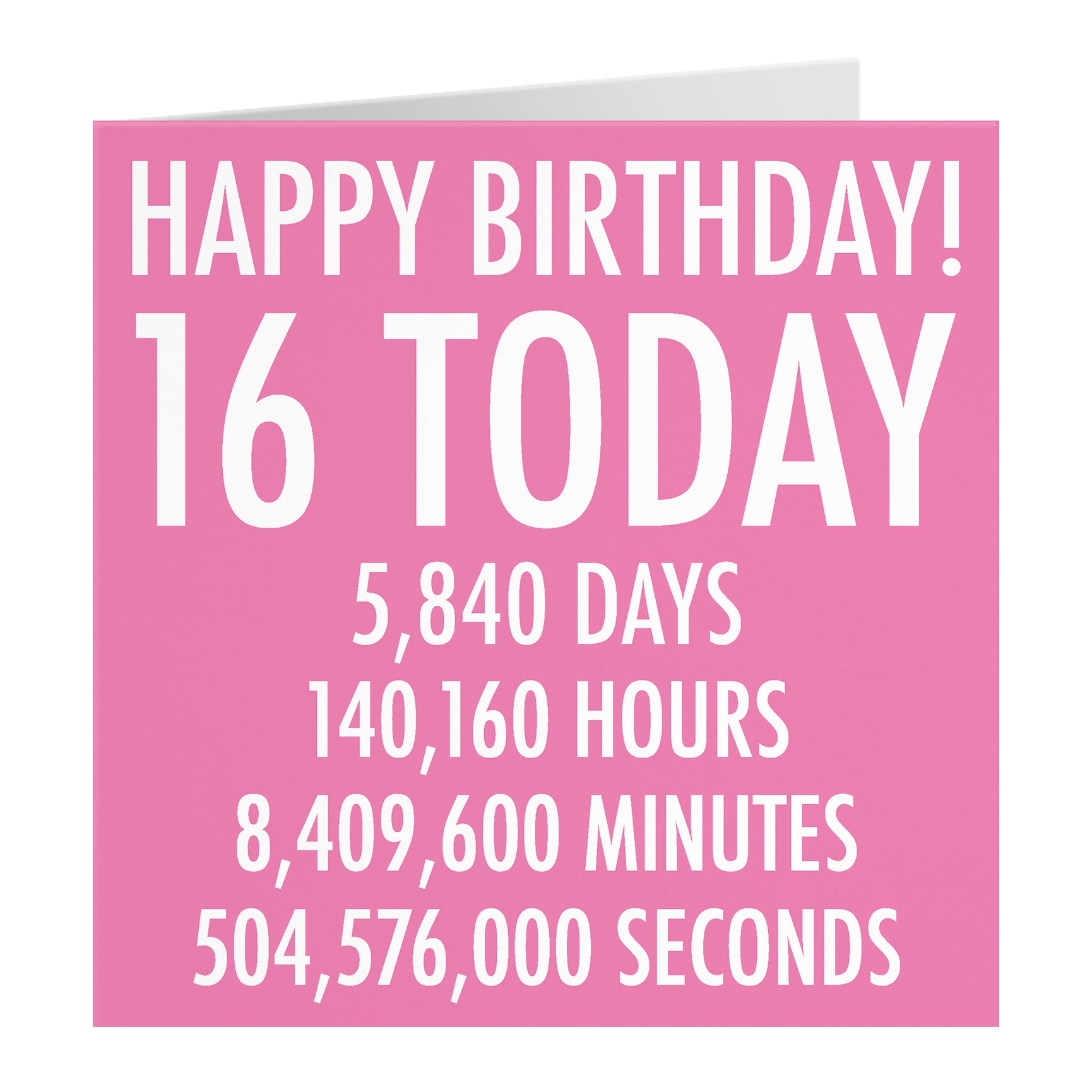 A bold, minimalist card design featuring white, block-style typography on a pink background. The text clearly presents the recipient's age followed by the equivalent time calculated in days, hours, and minutes.