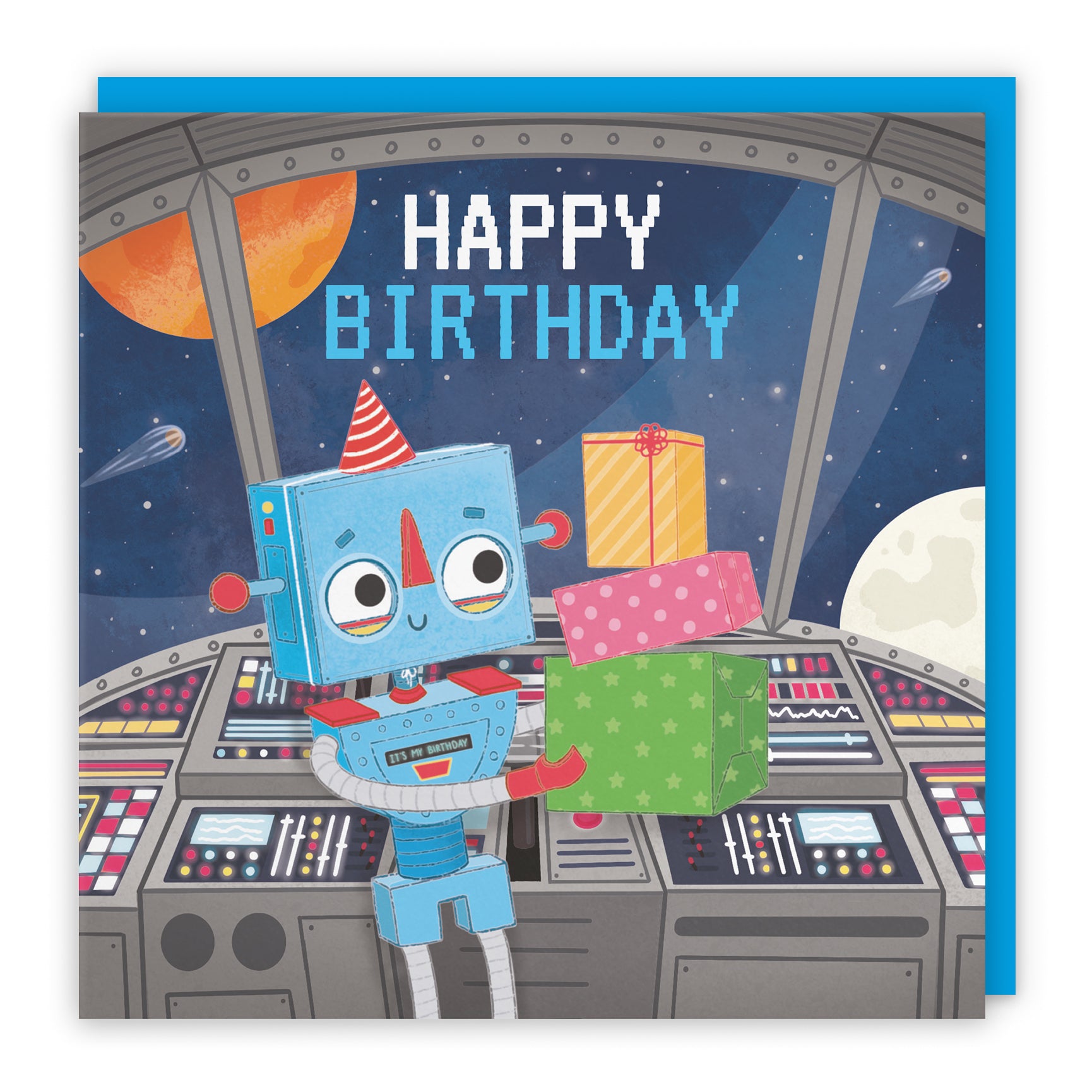 A cheerful little robot celebrates in a colourful spaceship cockpit, surrounded by glowing control panels and a star-filled galaxy beyond the windows. With bright presents in hand and a party hat on top, this fun sci-fi scene brings a playful burst of birthday excitement from outer space.