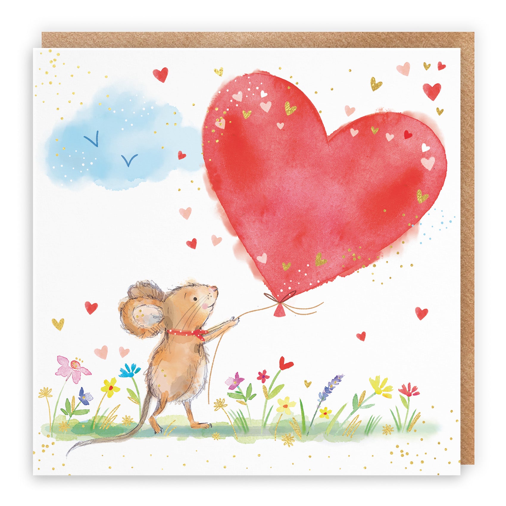 The card features a cute mouse holding a large heart shaped balloon.