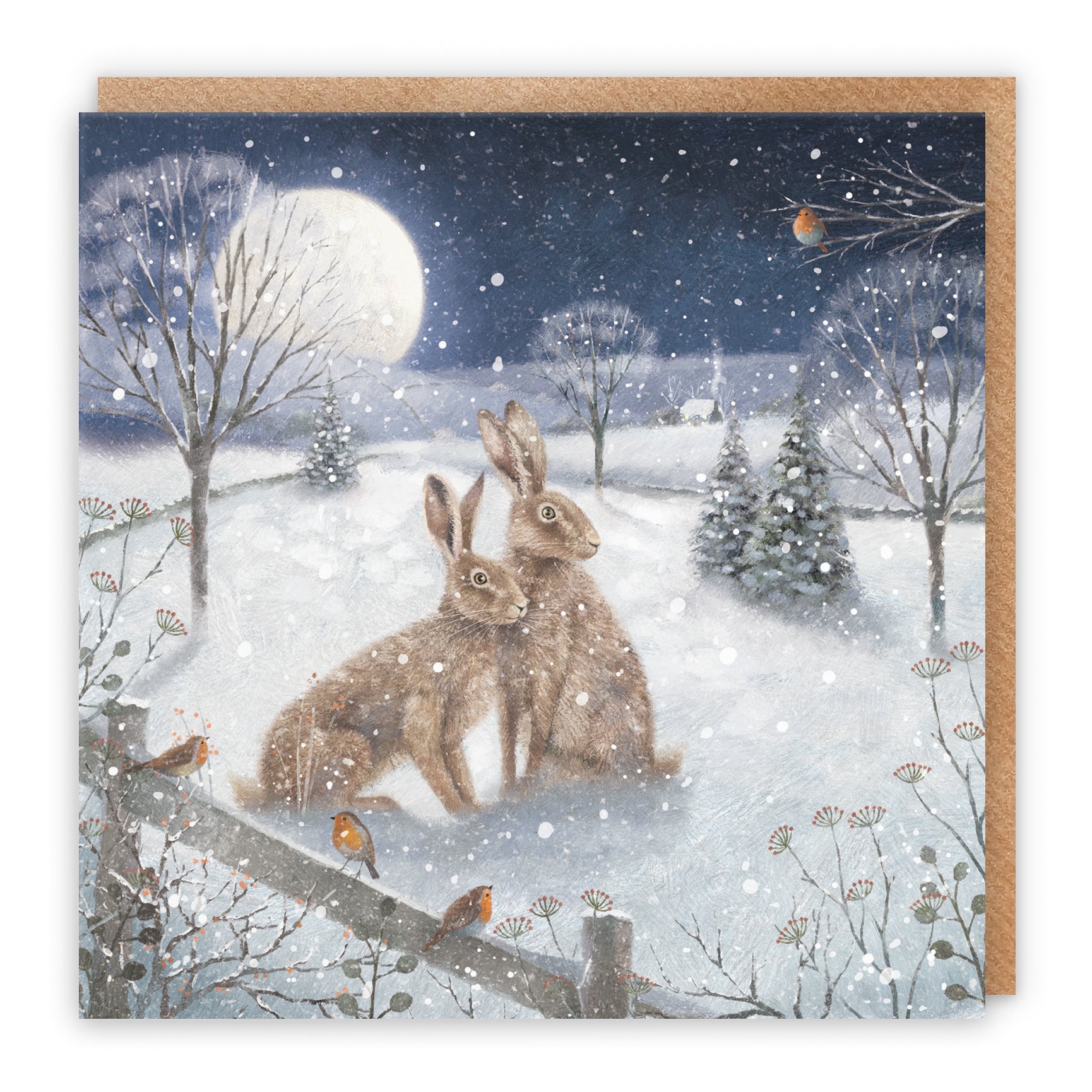 Two hares sit close together beneath a glowing winter moon, surrounded by softly falling snow and watchful robins. A peaceful woodland moment captured in a magical, frosty landscape.