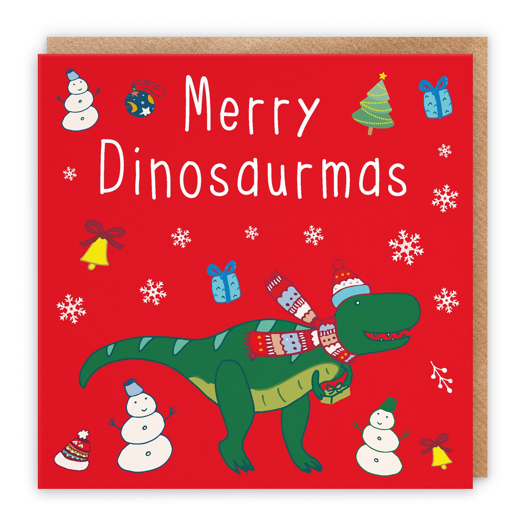 A fun, festive design featuring a cartoon T-Rex wearing a Christmas hat and scarf, set on a red background. The artwork is surrounded by graphic elements like snowmen, snowflakes, and small presents.