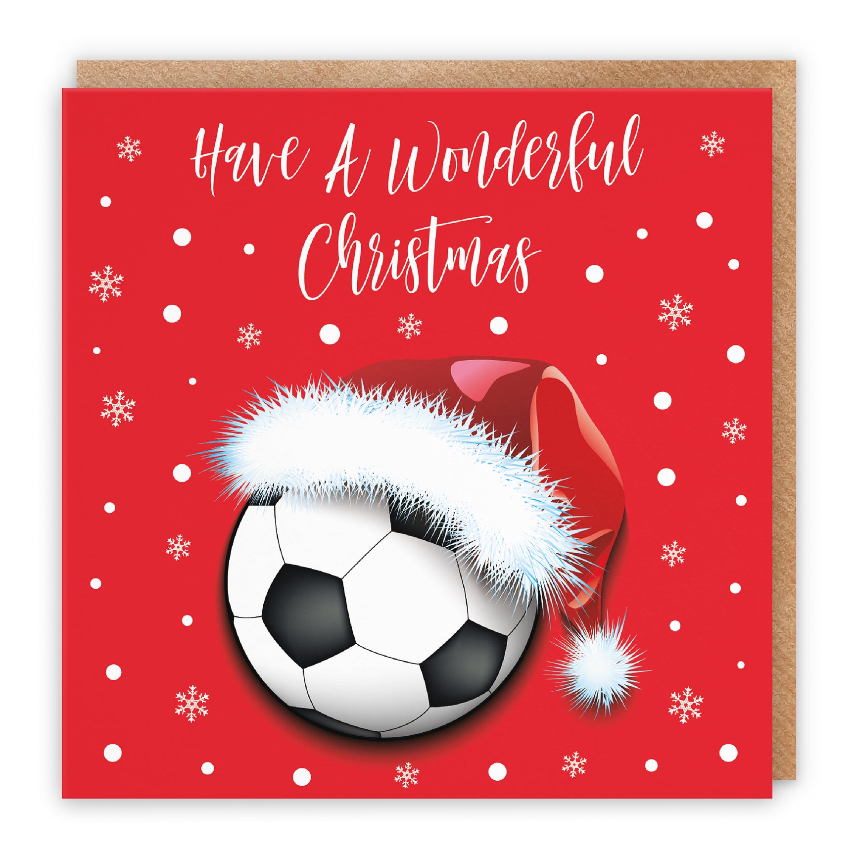 A simple, sporty Christmas design featuring a classic football wearing a Santa hat. The design is set on a solid red background and accented with falling snow and white snowflake graphics.