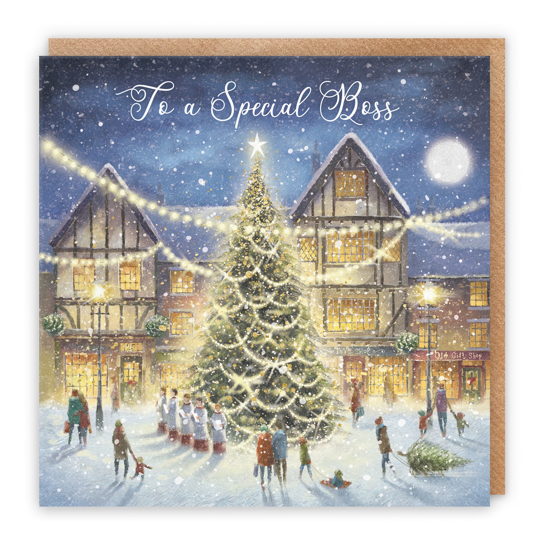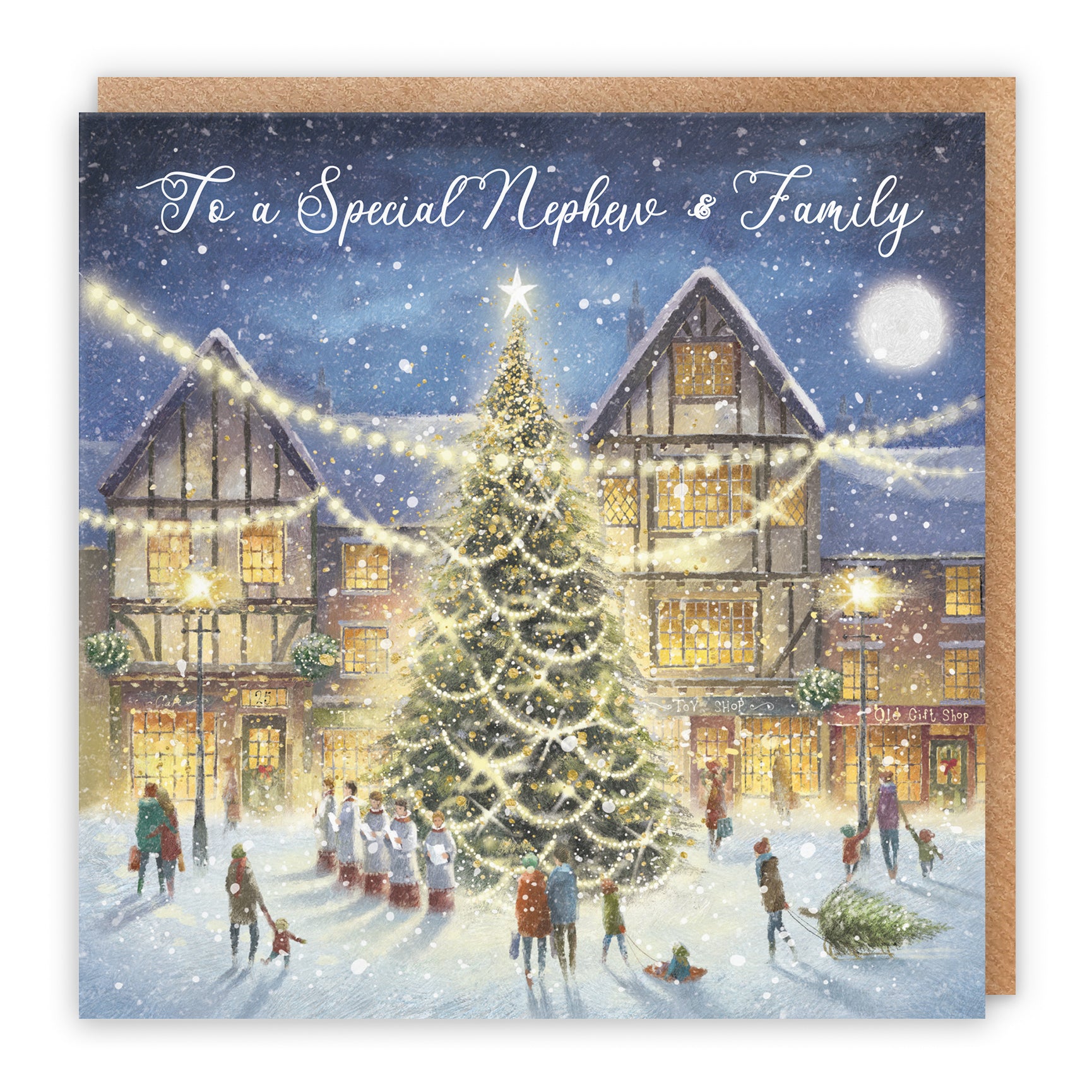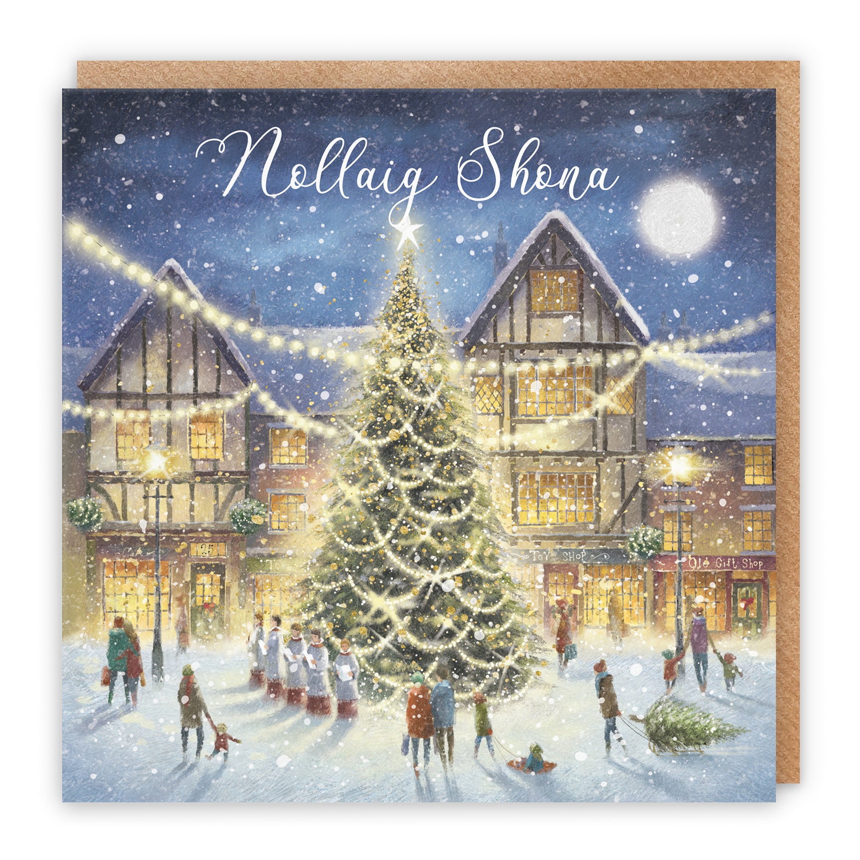 A magical town square sparkles under lights as families gather around a glowing Christmas tree. Carol singers perform in the snow, while shoppers bustle beneath a full moon.