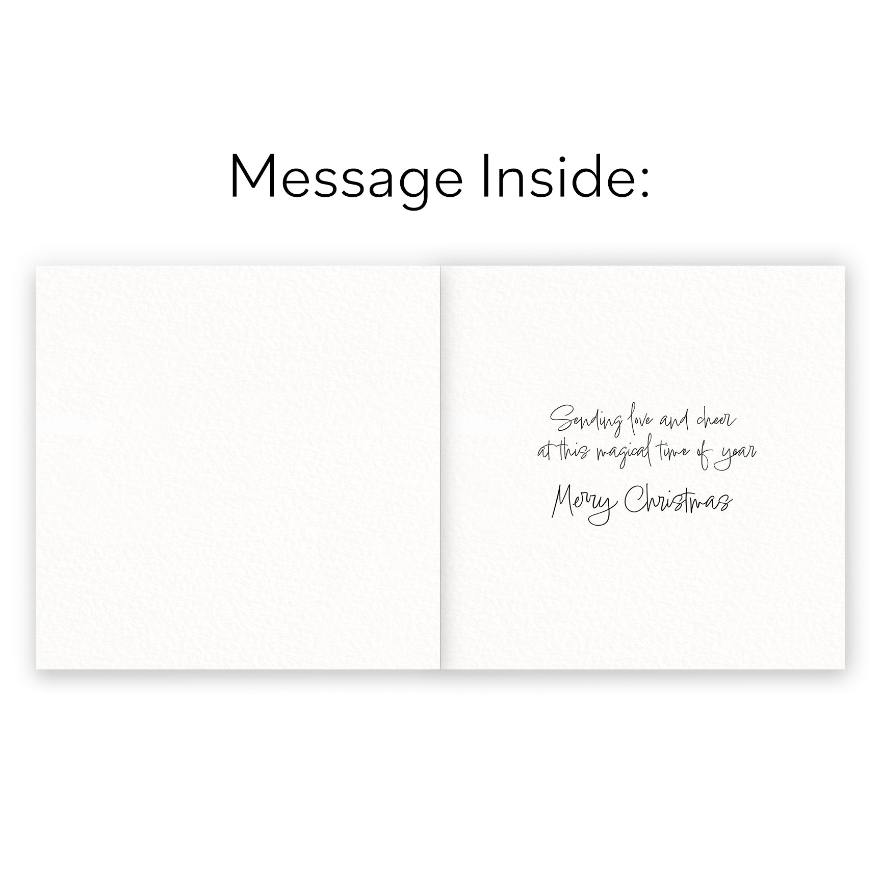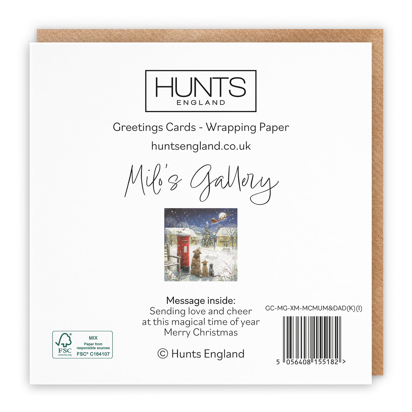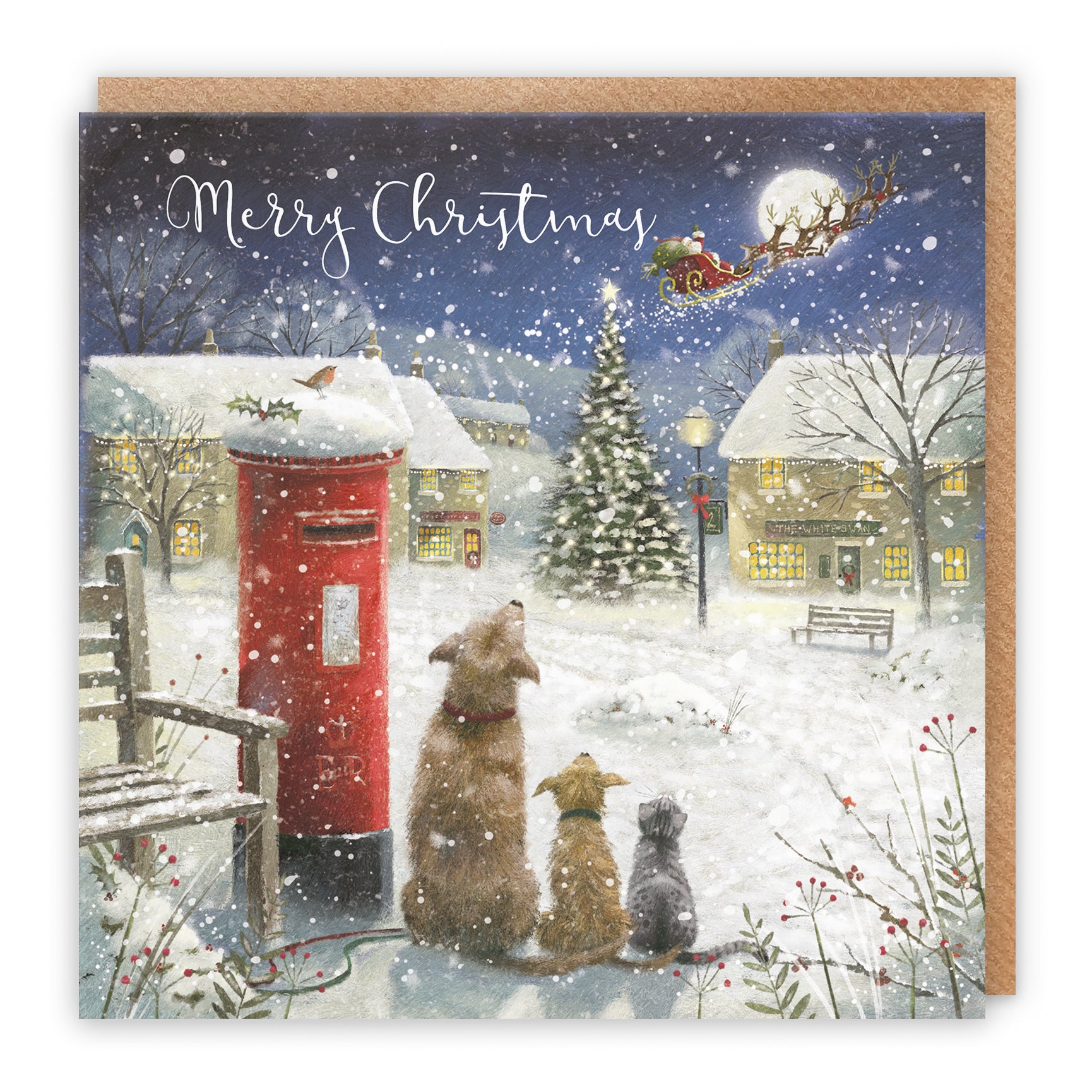 A snowy village scene featuring dogs and a cat gazing skyward as Santa's sleigh glides past the moon. A bright red postbox and twinkling Christmas tree add festive charm, while a robin perches nearby.