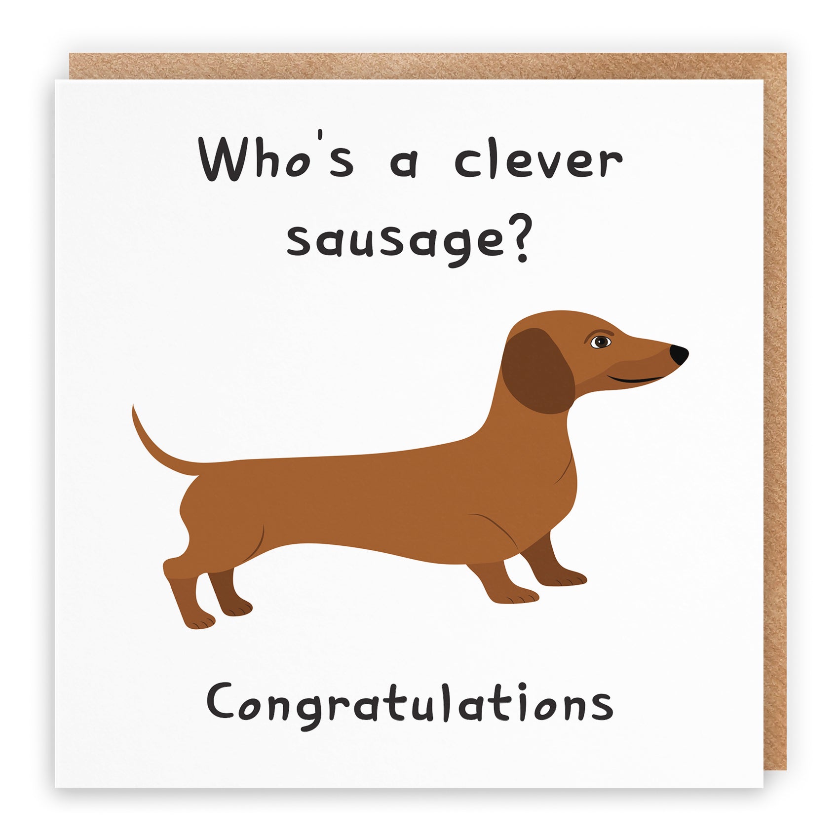 A fun congratulations card featuring a cheeky dachshund with the phrase ‘Who’s a clever sausage?’.