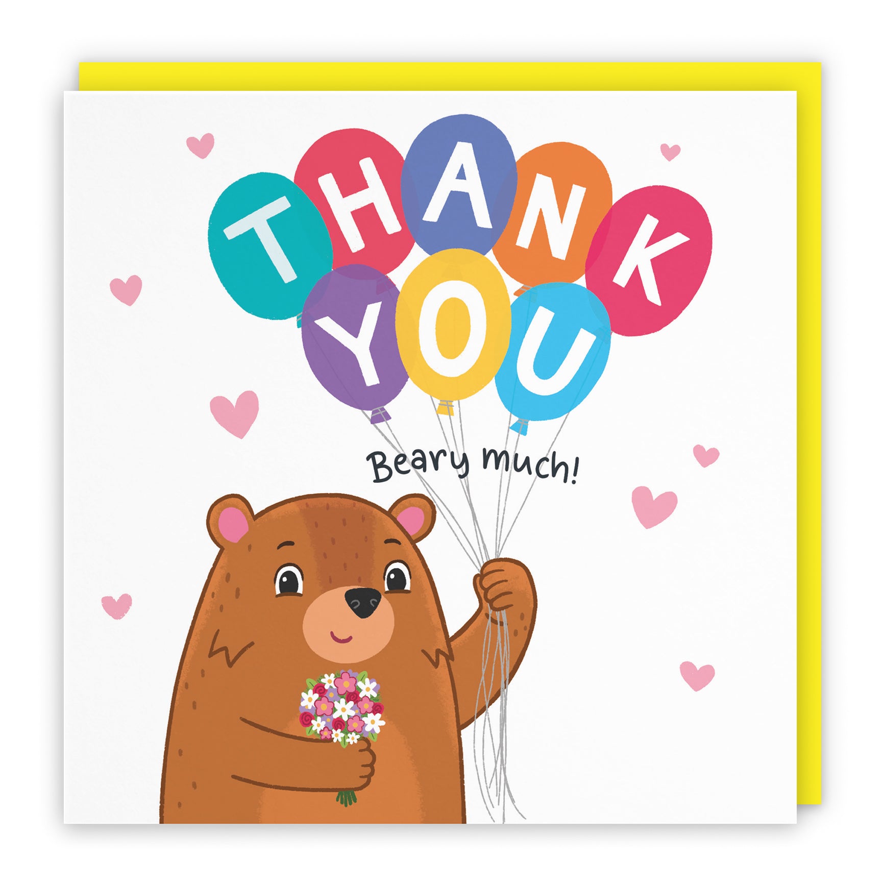 A cute, illustrative design set on a white background. The card features a friendly cartoon bear holding a bouquet of flowers and a bunch of balloons spelling "Thank You". The artwork includes small pink hearts.